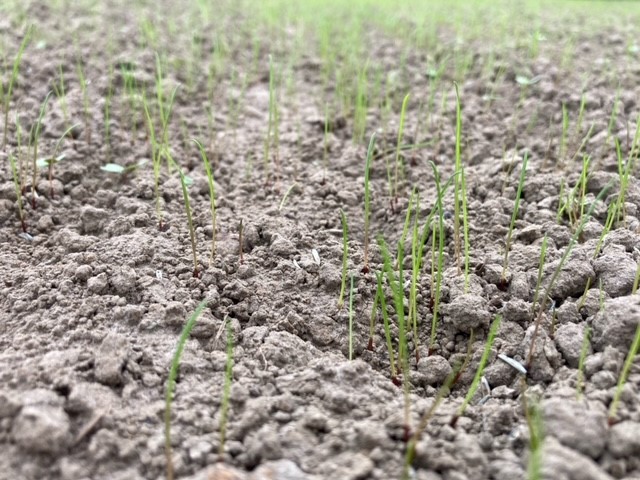 Das Ergebnis der Grünland-Neuansaat präsentierte sich nach 8 Tagen bereits als optimal aufgelaufen.